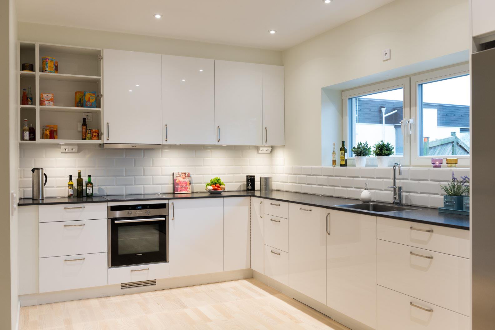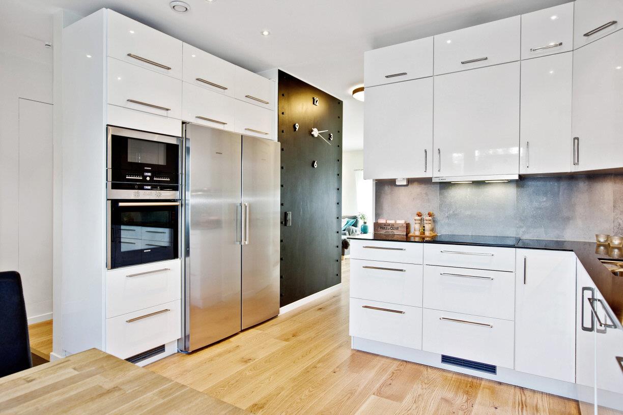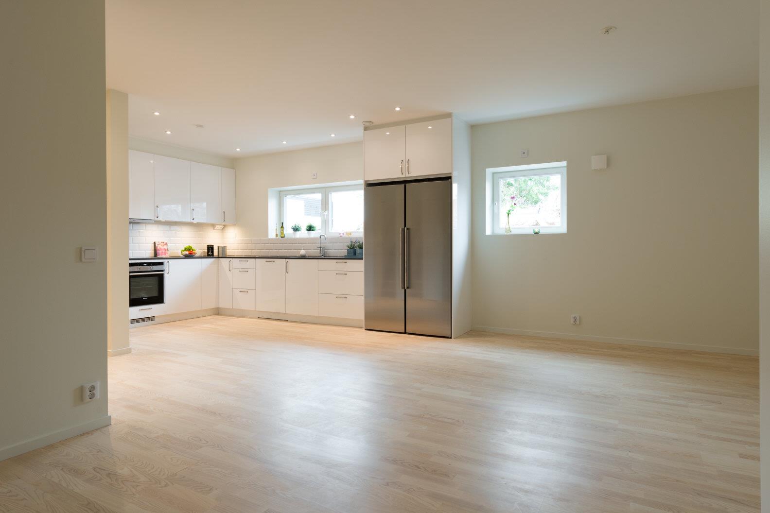 Vitvaror: Kyl, frys, spishäll (induktion), micro, ugn, köksfläkt, diskmaskin.
