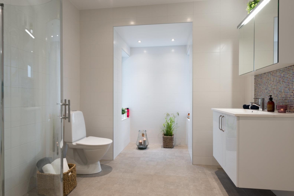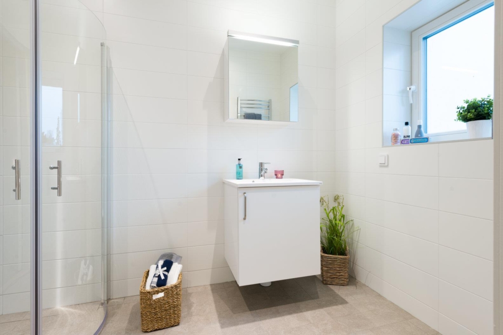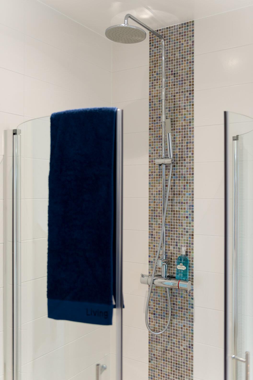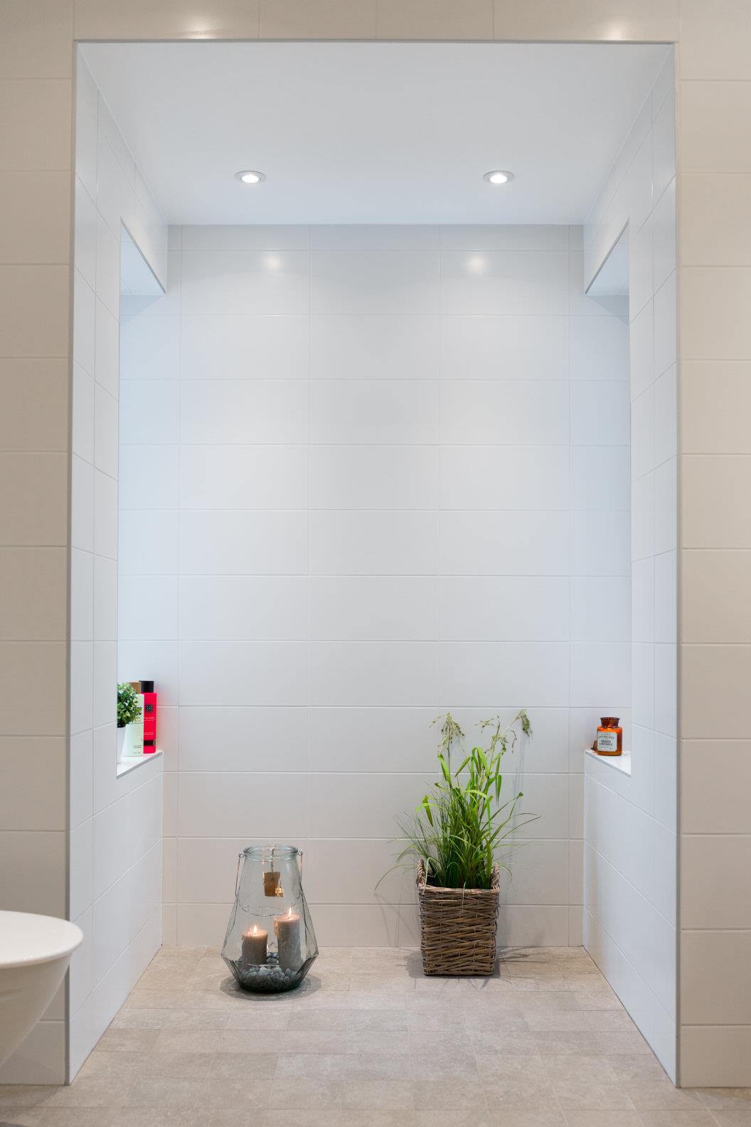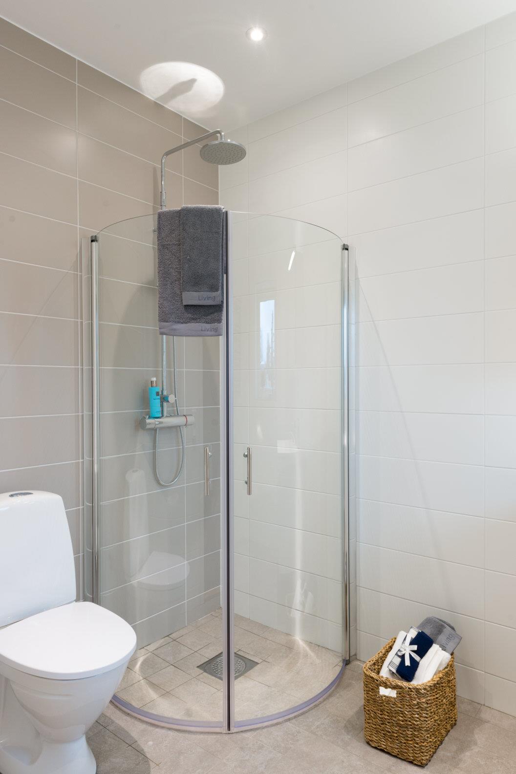 1 Duschplats med vikbara duschväggar. Duschblandare från FM Mattsson. Duschset från FM Mattsson