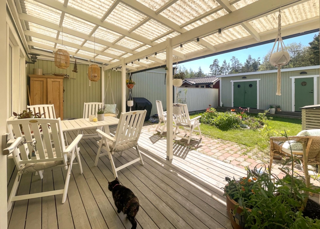 - Solig och insynsskyddad tomt med bl.a. stor träaltan under tak, vackra planteringar och nybyggt förråd.