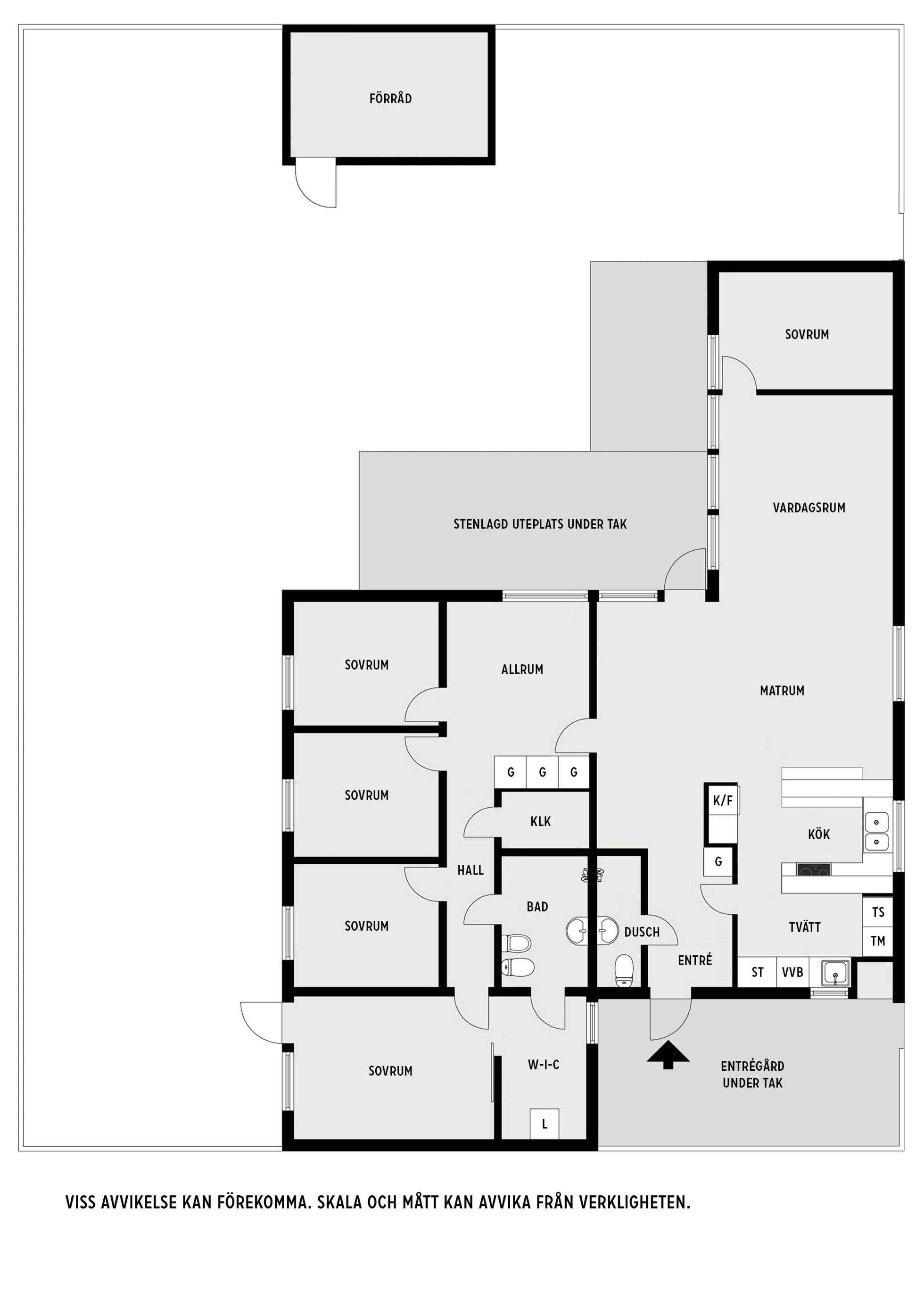 Huset har en härligt öppen planlösning mellan kök, matrum och vardagsrum. En separat sovrumsavdelning med extra allrum och 3-5 sovrum, klädkammare och badrum. Intill entréhallen finns ett duschrum samt tvättrum. Det går även lätt att dela av ytterligare ett sovrum i den bortre änden av det stora vardagsrummet. Huset har en mycket flexibel planlösning där endast en innervägg i huset är bärande.