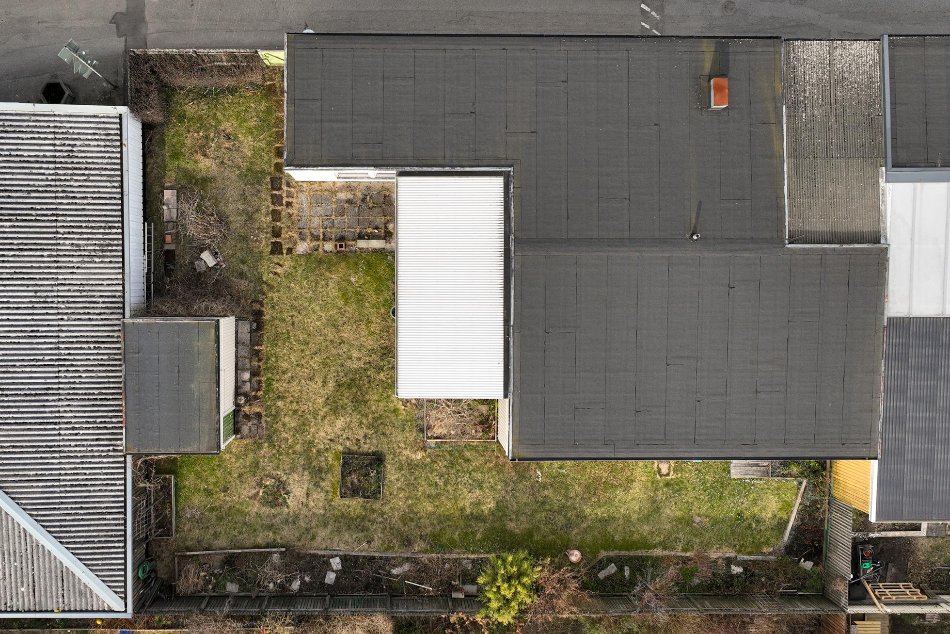 Huset ligger fristående i gavelläge på en mycket solig sydväst-vänd tomt som är upphöjd mot angränsande fastigheter. Tomten är betydligt större än normaltomten (398 kvm mot normala 310 kvm). På entrésidan finns ett vackert torg med gräsmatta med stenlagda gångar, träd, rabatter, sandlåda, lekstuga och en arkitektritad pergola med stor sittgrupp. Tomten har en stor praktisk stenlagd entrégård under tak med plats för cyklar, barnvagnar och förvaring. Den mycket soliga och helt insynsskyddade trädgårdstomten är plan med gräsmatta och är omgärdad av ett plank.