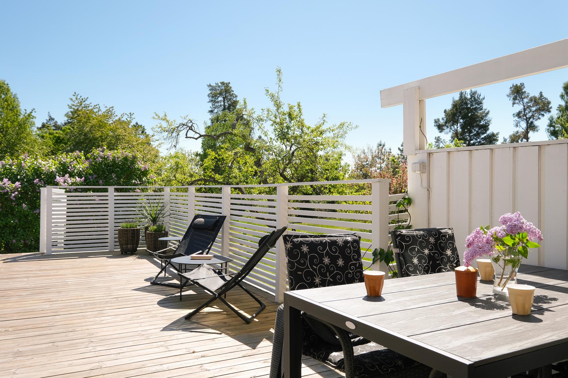 Huset har ett fantastiskt läge med en fin insynsskyddad stenlagd entrégård med markis på framsidan och en mycket stor tomt på baksidan med en härligt rymlig träaltan byggd 2019 med fint spaljéstaket och lyxigt spa-bad samt markis. Tomten sträcker sig ytterligare en bit ut (mot den intilliggande ängsallmänningen och skogen) med en liten gräsyta omgärdad av vackra, insynsskyddande, syrénbuskar.
