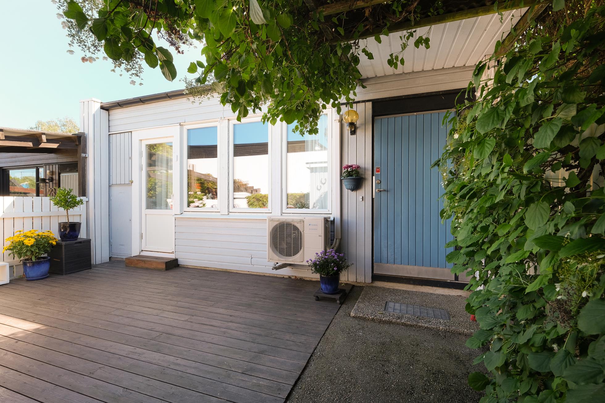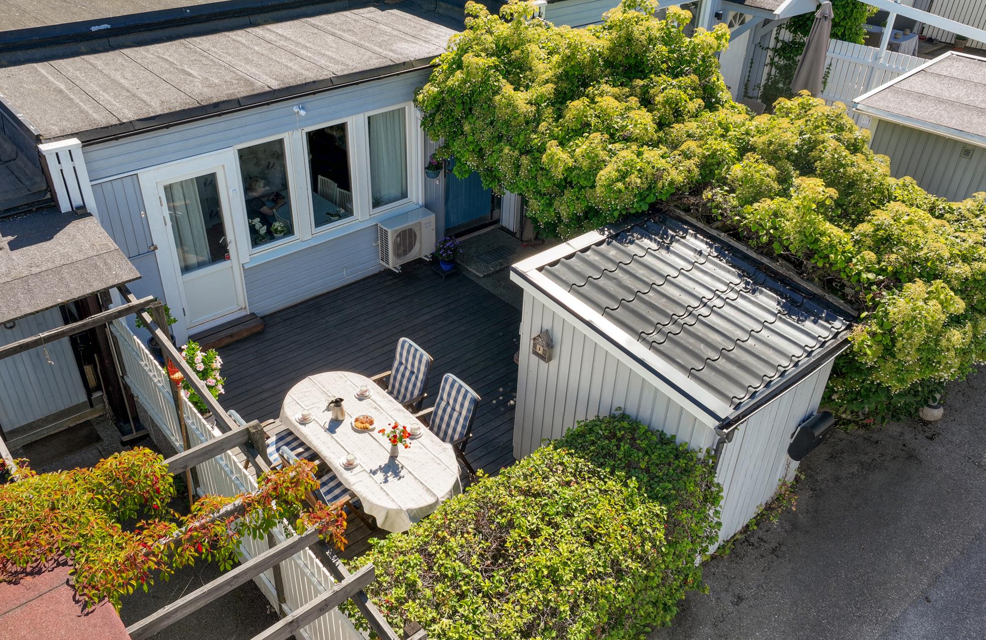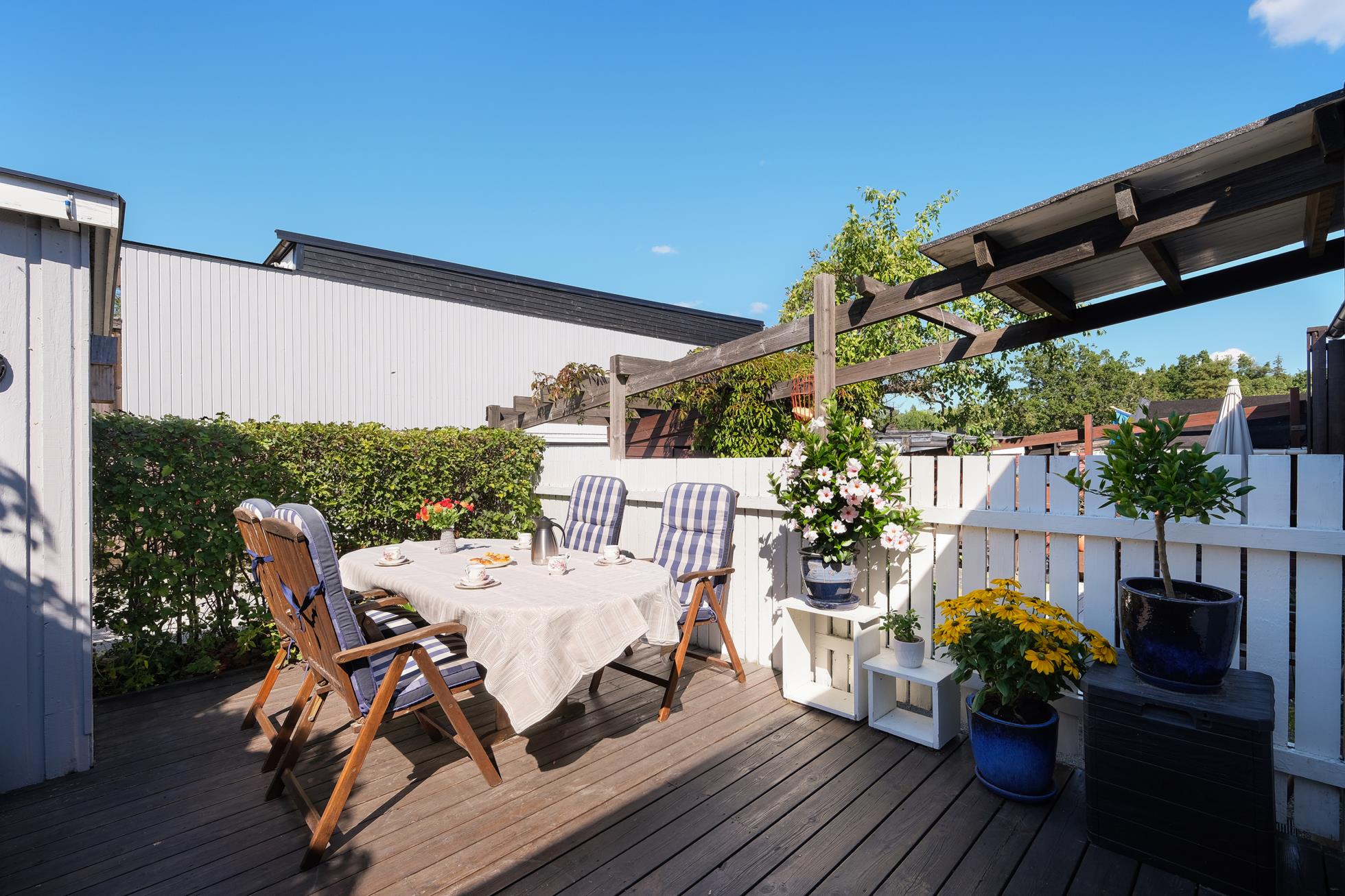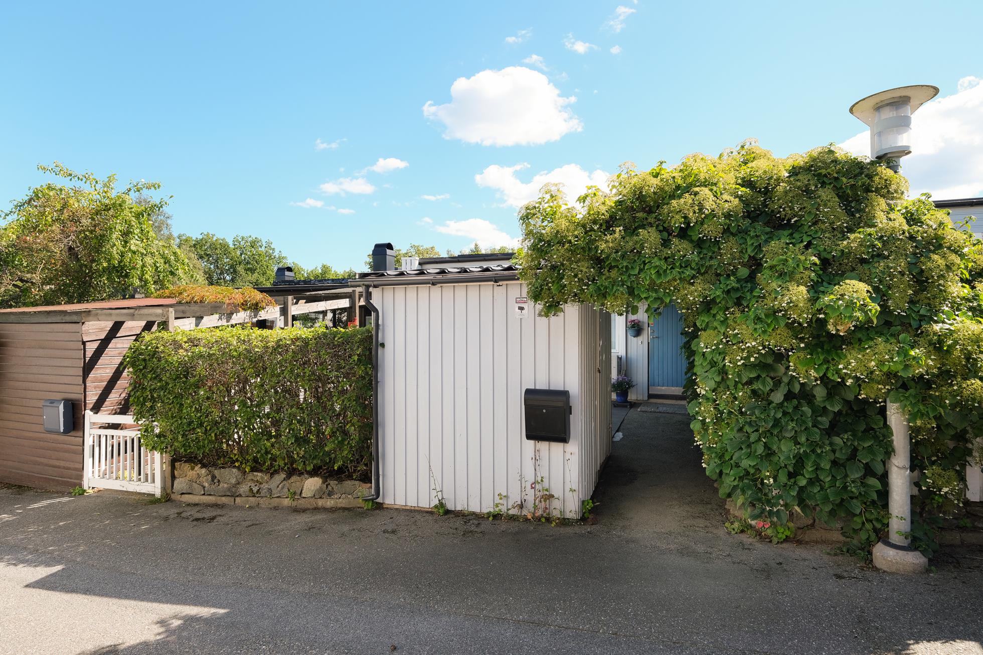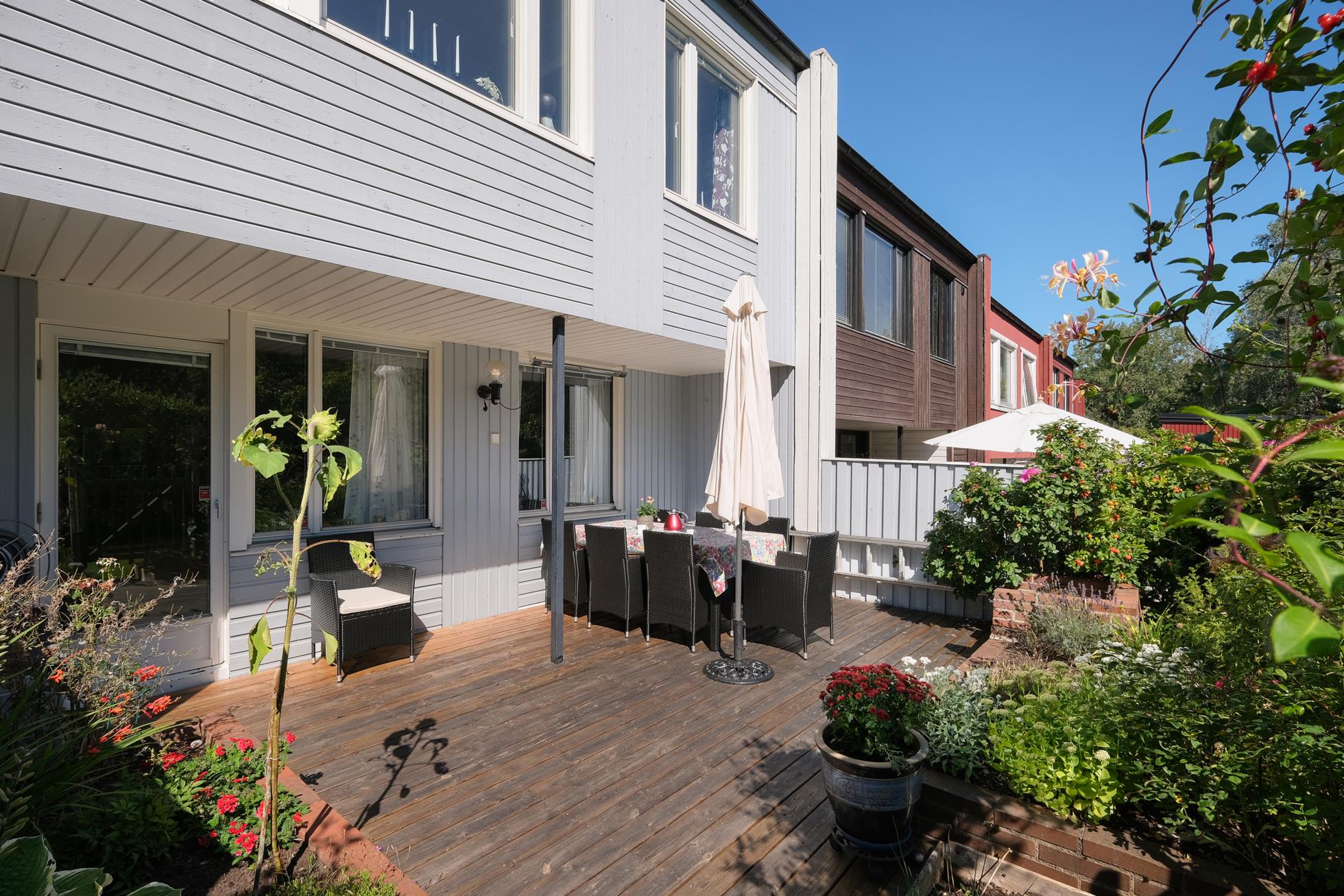 På entrésidan finns en extra stor, insynskyddad uteplats med rymlig träaltan och ett eget förråd. På baksidan finns en stor och mycket fin trädgårdstomt med ett underbart läge direkt gränsande mot skogsallmänning. Intill huset finns en stor träaltan delvis under tak med fina planteringar och grind ut mot en stor gräsmatta med vackra rabatter.