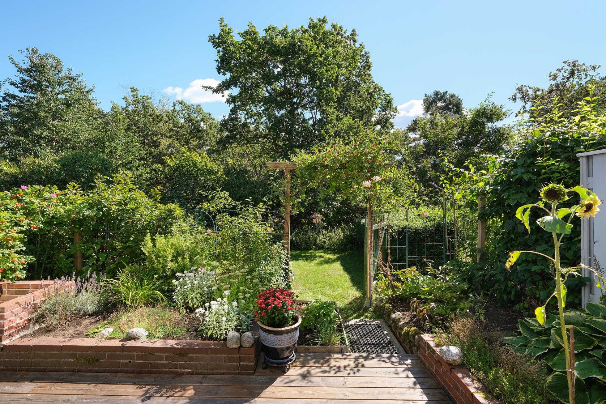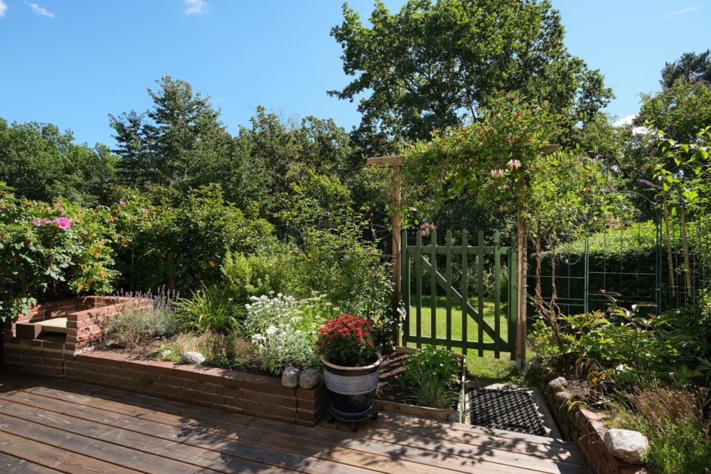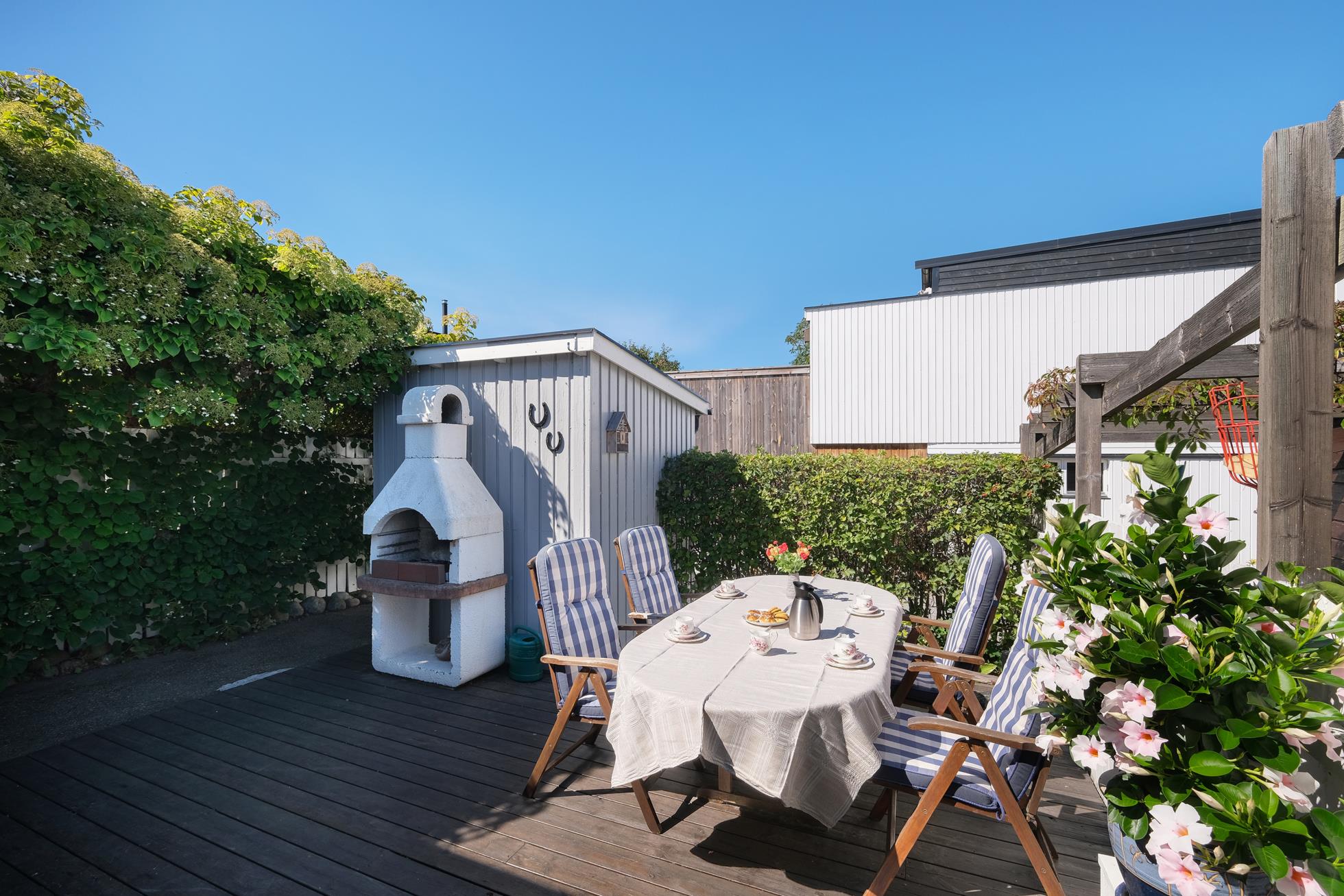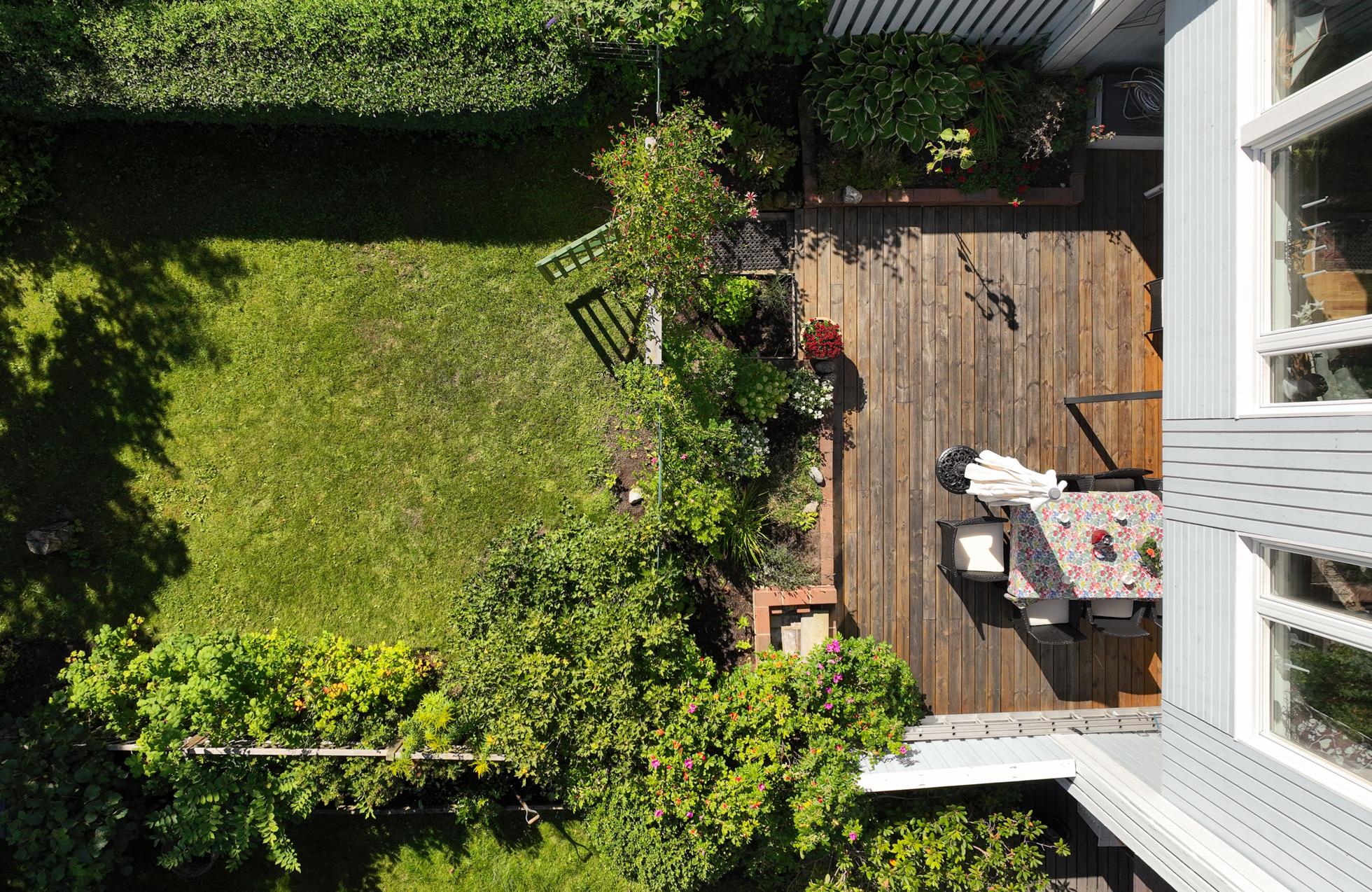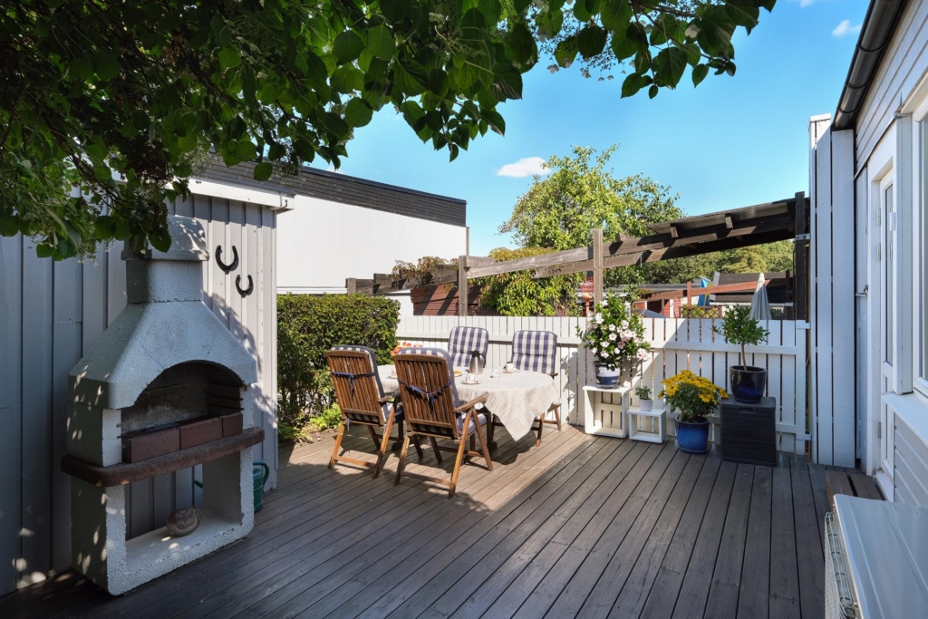 På entrésidan finns en extra stor, insynskyddad uteplats med rymlig träaltan och ett eget förråd. På baksidan finns en stor och mycket fin trädgårdstomt med ett underbart läge direkt gränsande mot skogsallmänning. Intill huset finns en stor träaltan delvis under tak med fina planteringar och grind ut mot en stor gräsmatta med vackra rabatter.