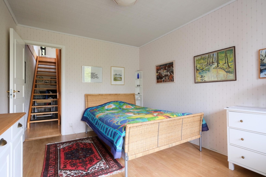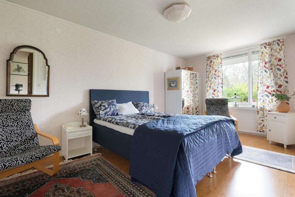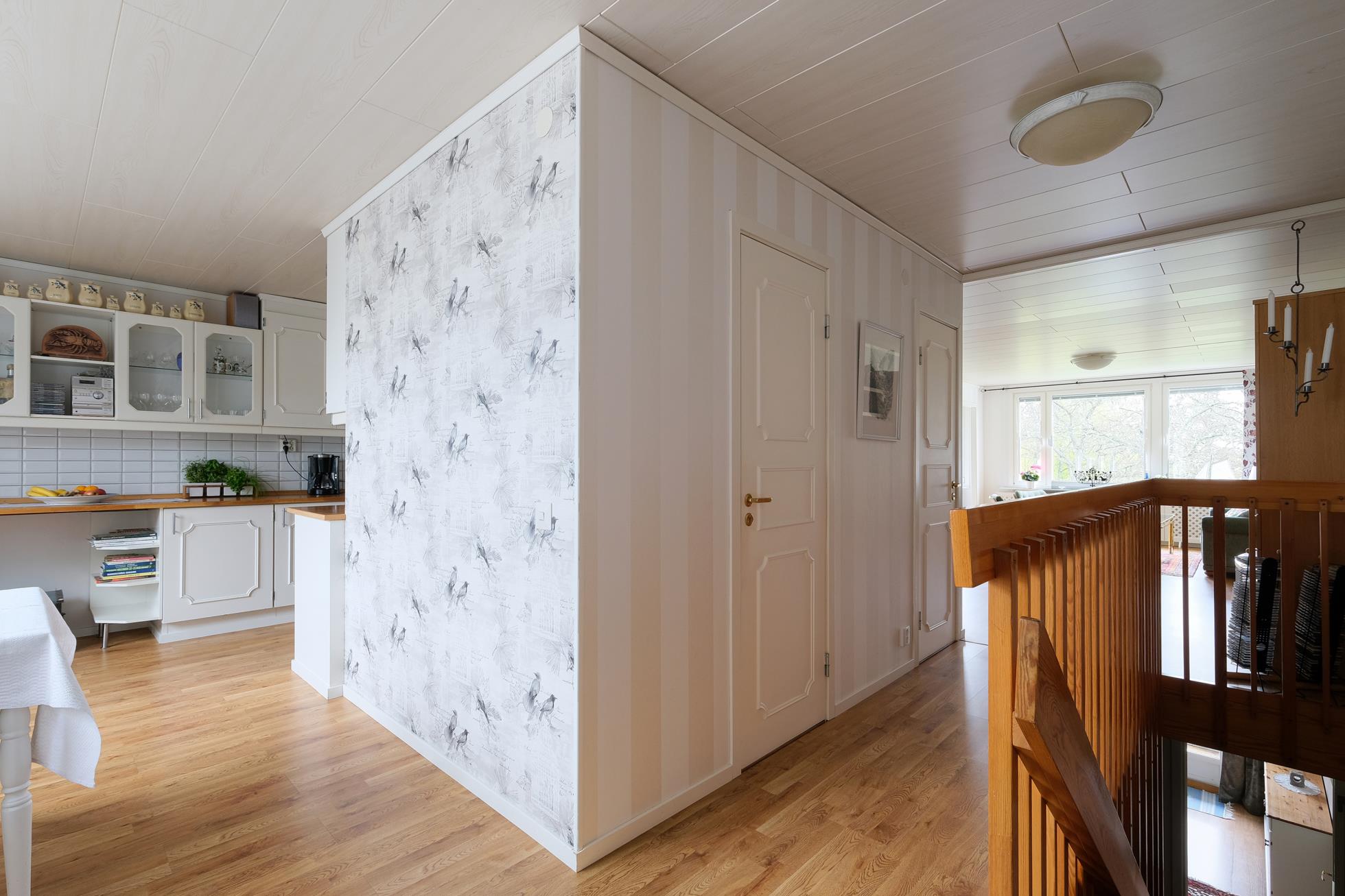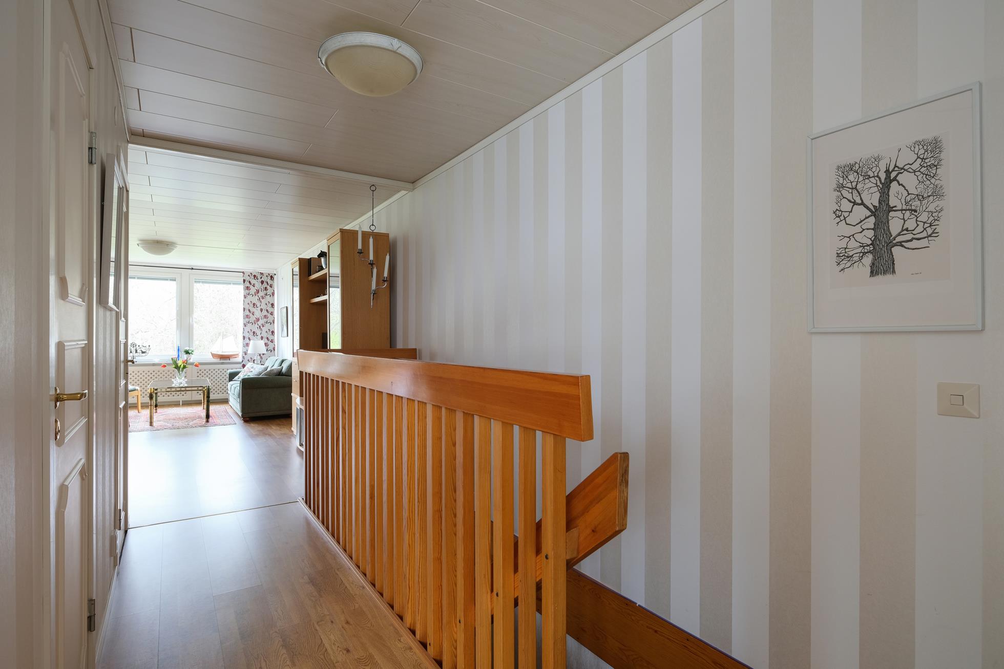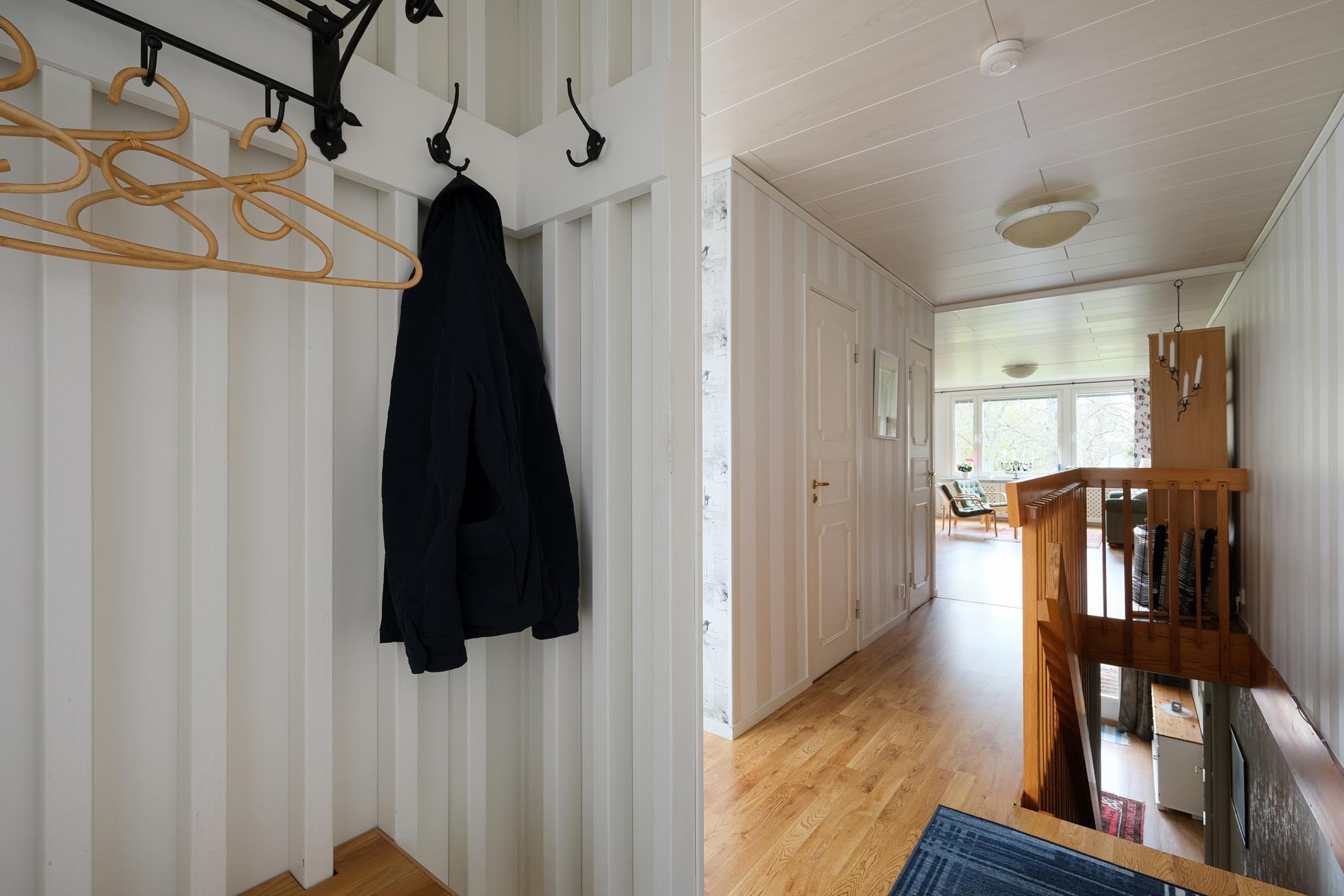 Stor skyddad entrésida med träaltan och eget förråd. Huset är genomgående mycket ljust och välplanerat. När man kliver in i entréhallen ser man rakt ut i skogen via den öppna planlösningen med stort vinklat vardagsrum (där ett extra sovrum lätt kan delas av). På entréplanet finns även kök med matplats, ett rymligt förråd, tvättstuga och separat wc. På nedre plan finns ett litet allrum, två stora sovrum (varav ett är mycket stort och det andra har utgång till träaltan och den stora vackra och lummiga trädgårdstomten. Det finns även ett trevligt kaklat duschrum samt ett mycket stort förråd i den bakre delen.