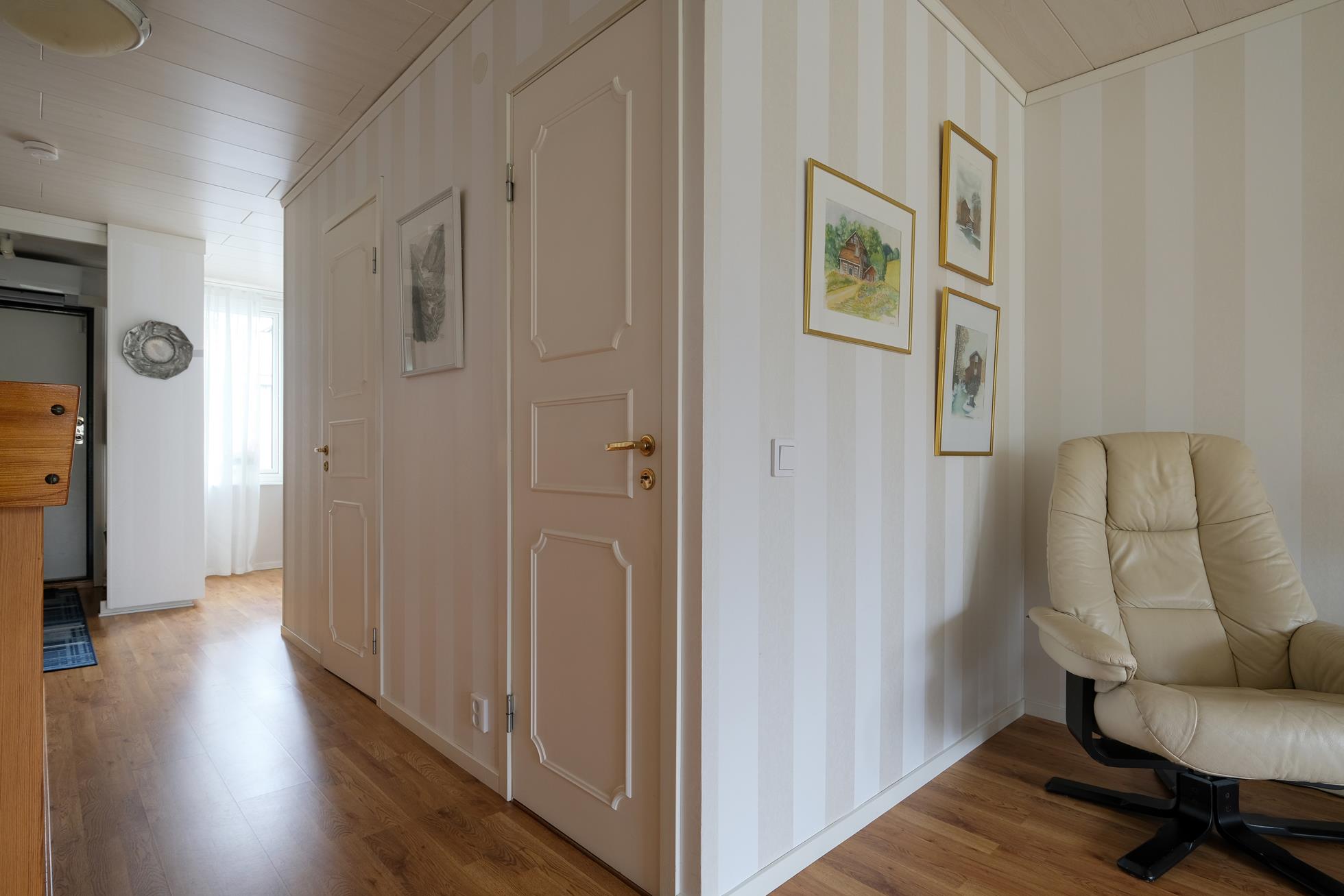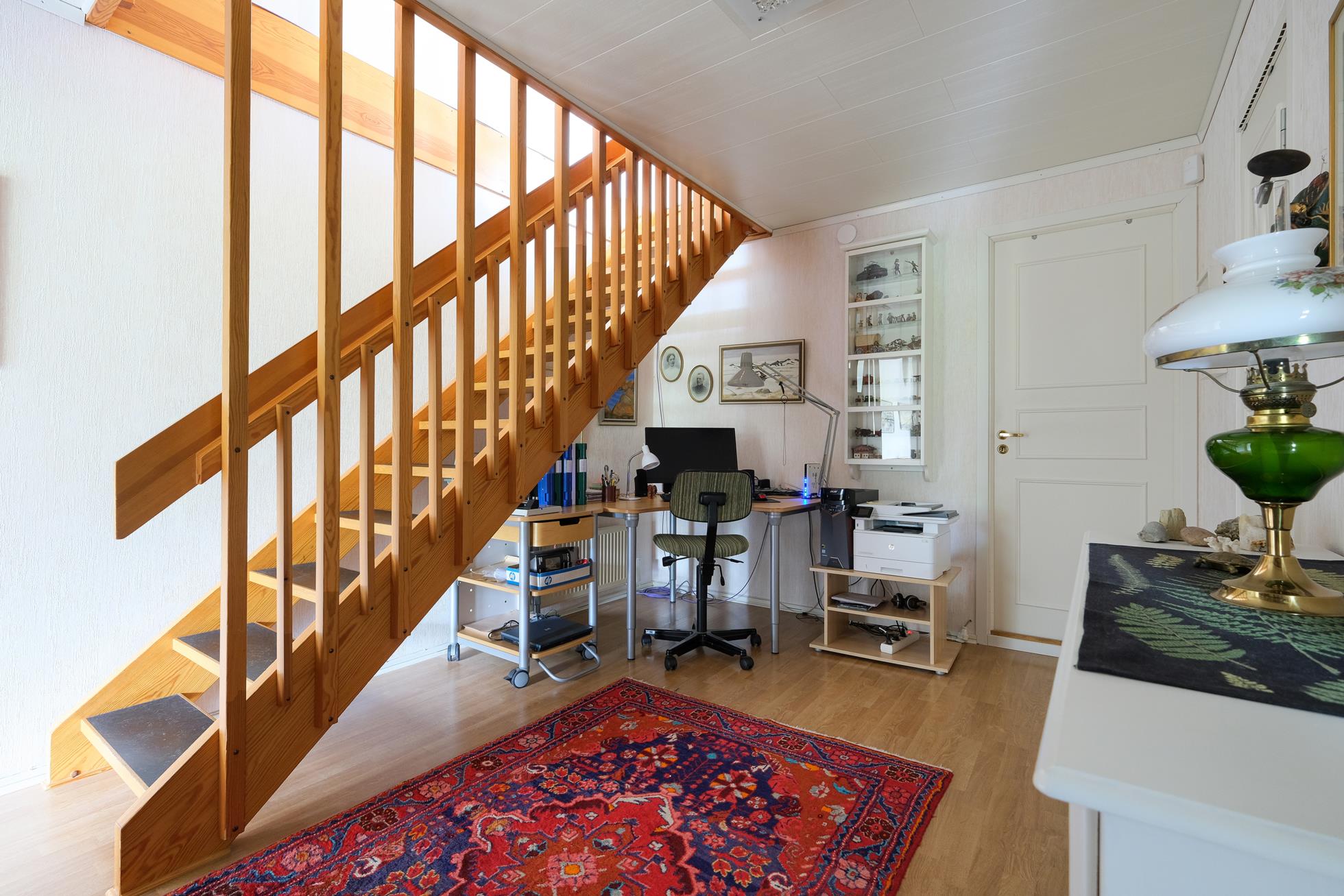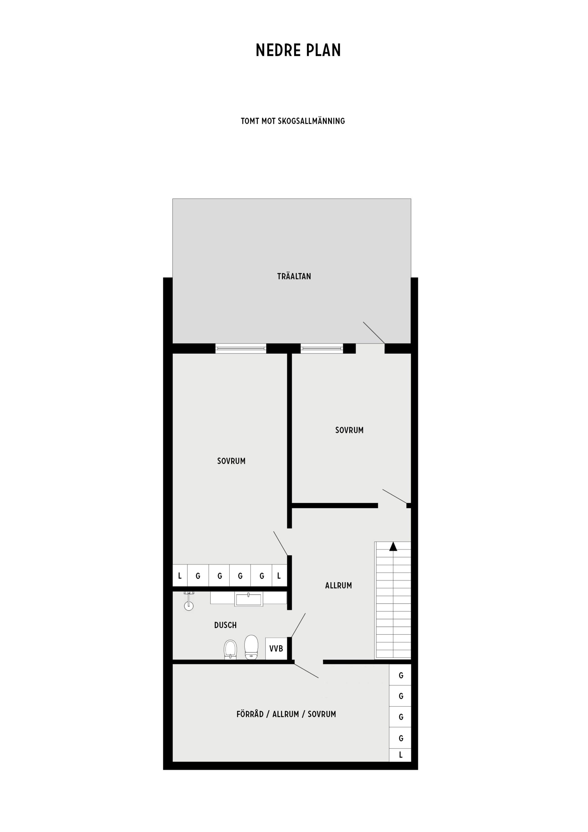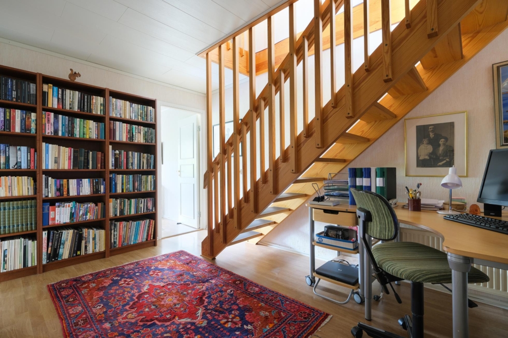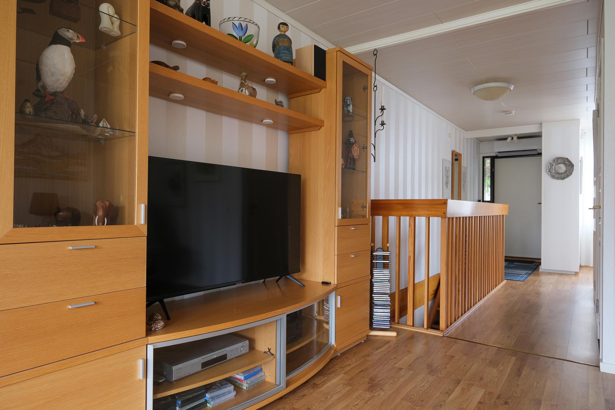 Stor skyddad entrésida med träaltan och eget förråd. Huset är genomgående mycket ljust och välplanerat. När man kliver in i entréhallen ser man rakt ut i skogen via den öppna planlösningen med stort vinklat vardagsrum (där ett extra sovrum lätt kan delas av). På entréplanet finns även kök med matplats, ett rymligt förråd, tvättstuga och separat wc. På nedre plan finns ett litet allrum, två stora sovrum (varav ett är mycket stort och det andra har utgång till träaltan och den stora vackra och lummiga trädgårdstomten. Det finns även ett trevligt kaklat duschrum samt ett mycket stort förråd i den bakre delen.