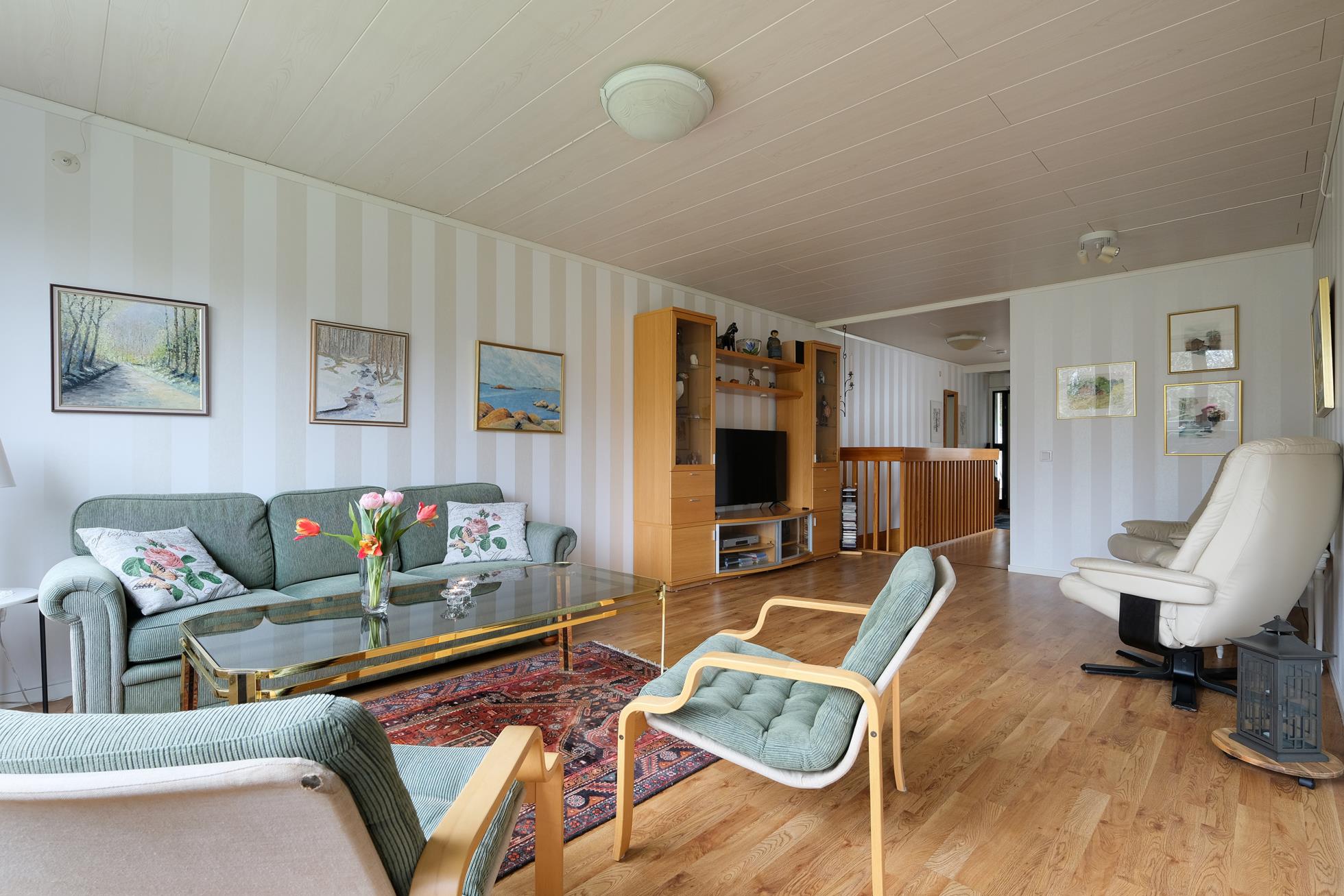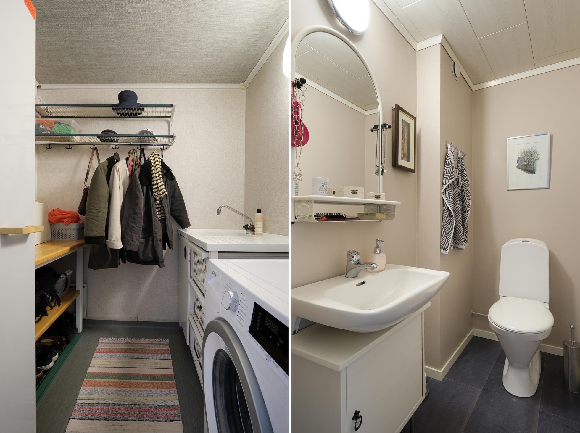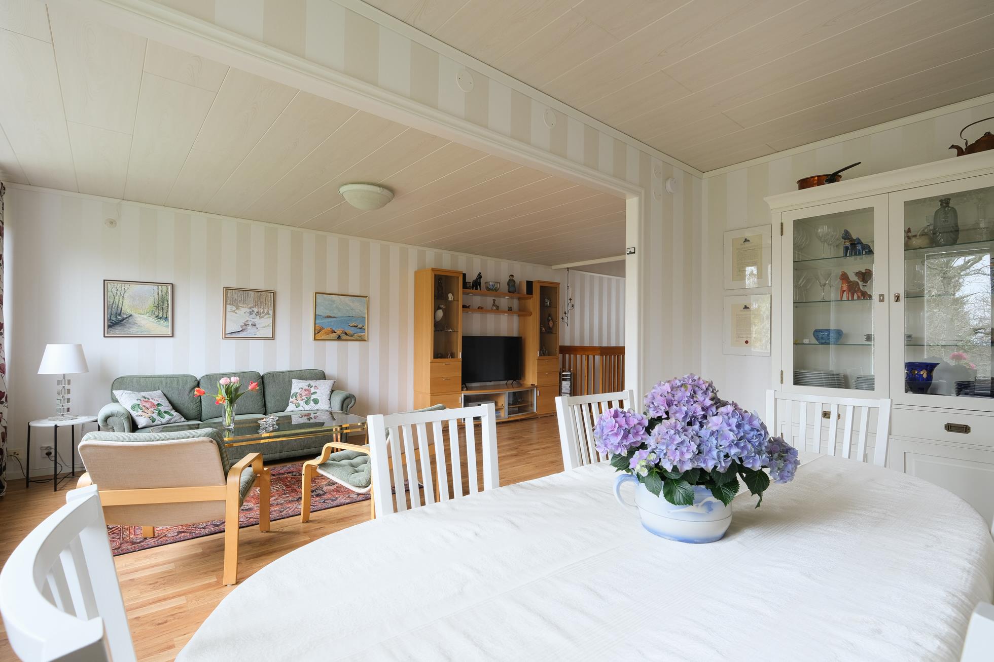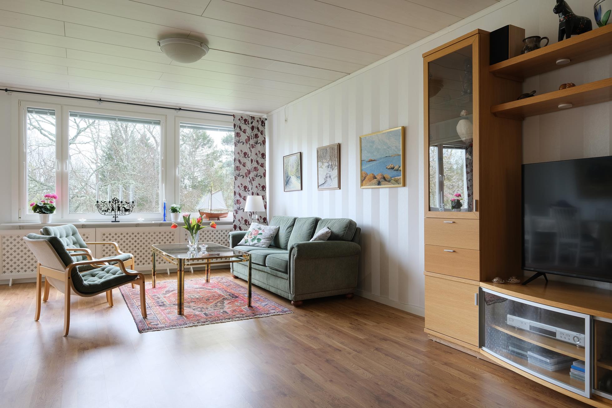 Stor skyddad entrésida med träaltan och eget förråd. Huset är genomgående mycket ljust och välplanerat. När man kliver in i entréhallen ser man rakt ut i skogen via den öppna planlösningen med stort vinklat vardagsrum (där ett extra sovrum lätt kan delas av). På entréplanet finns även kök med matplats, ett rymligt förråd, tvättstuga och separat wc. På nedre plan finns ett litet allrum, två stora sovrum (varav ett är mycket stort och det andra har utgång till träaltan och den stora vackra och lummiga trädgårdstomten. Det finns även ett trevligt kaklat duschrum samt ett mycket stort förråd i den bakre delen.