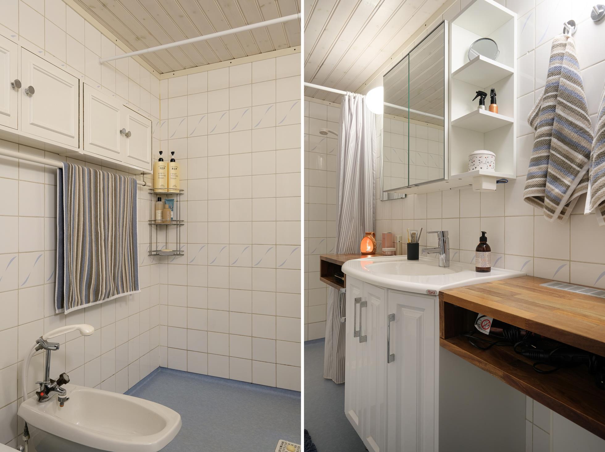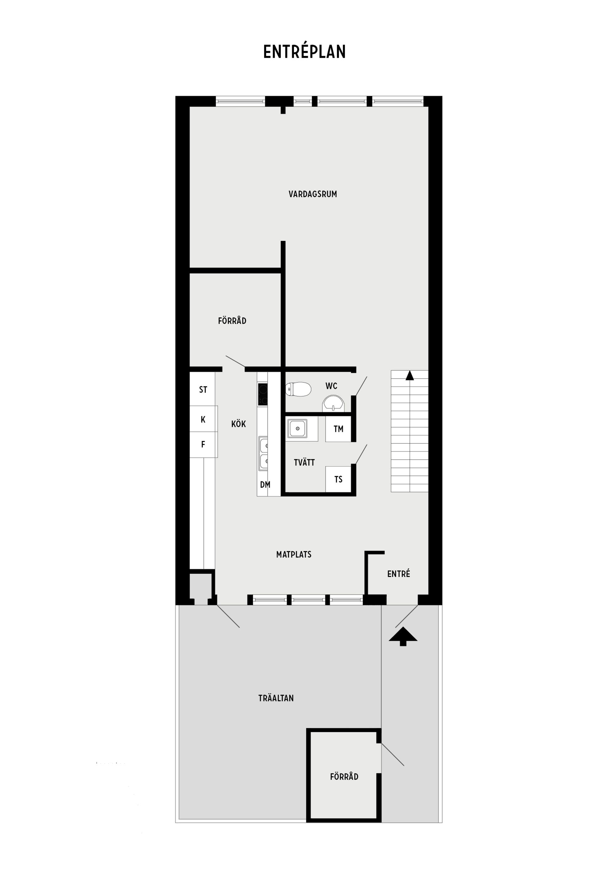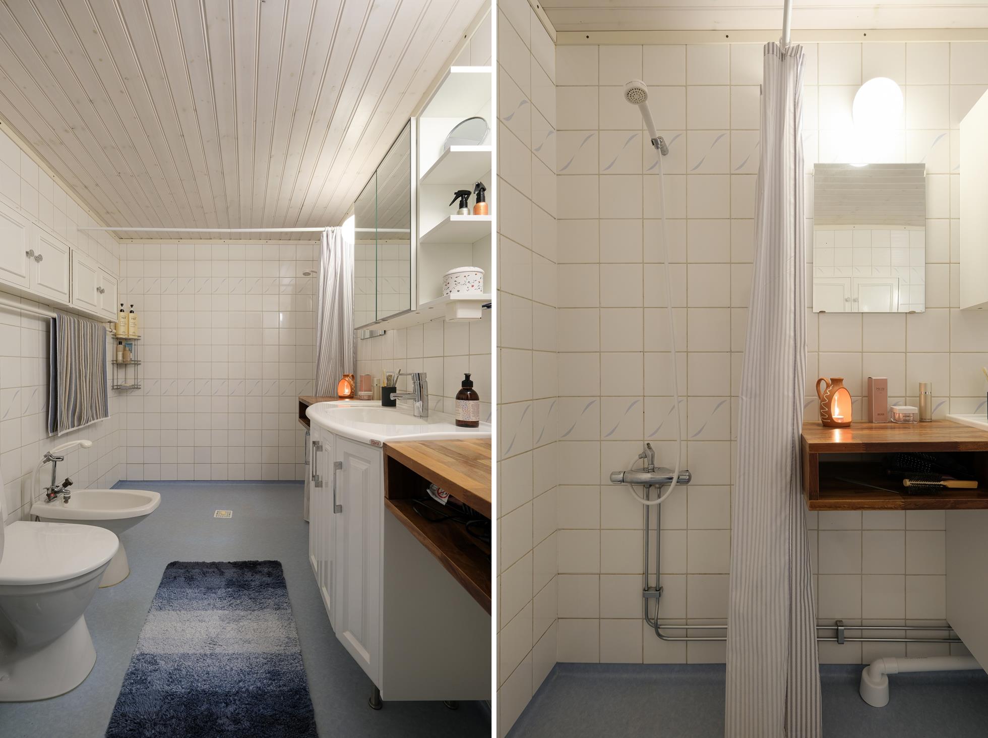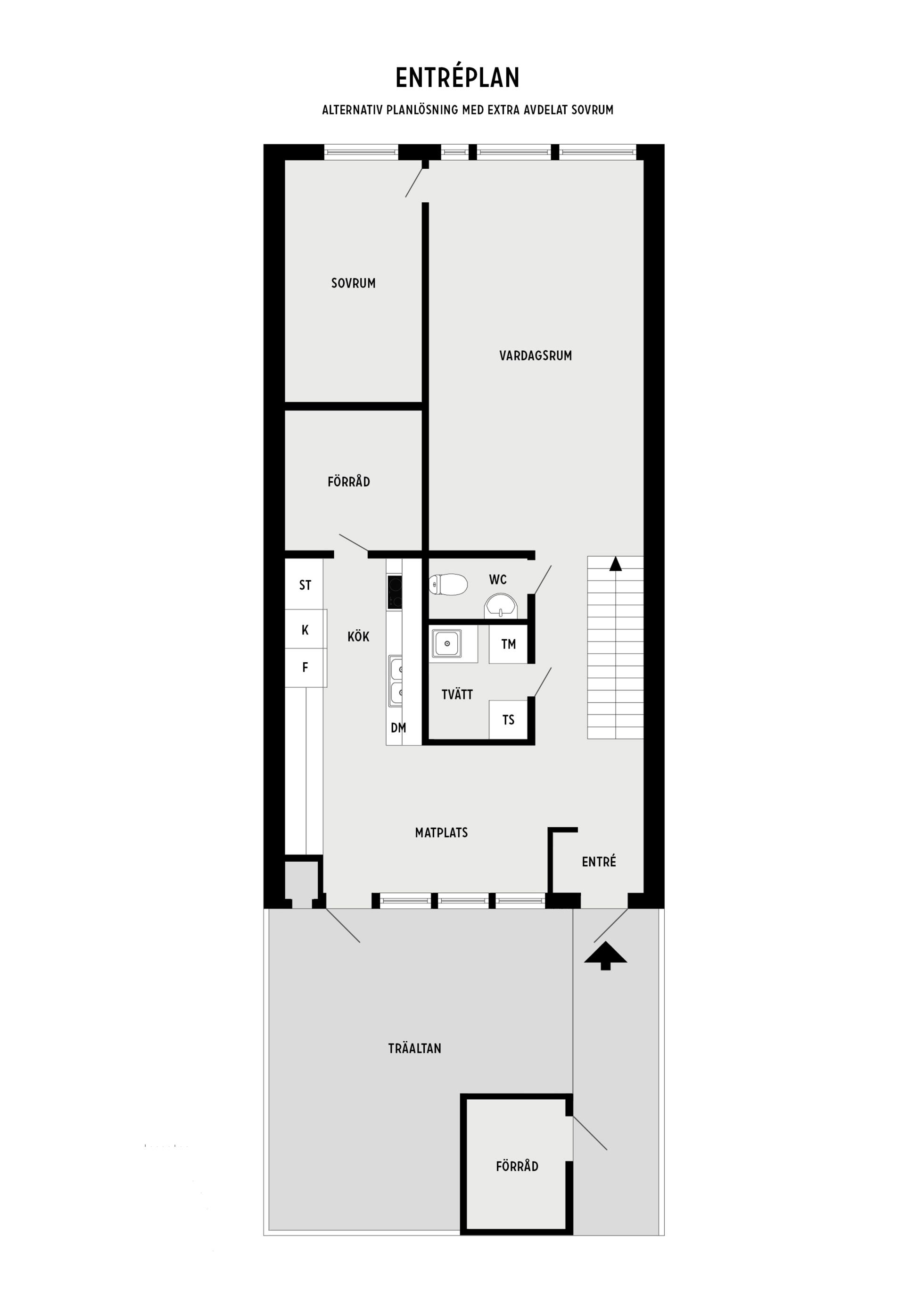 Stor skyddad entrésida med träaltan och eget förråd. Huset är genomgående mycket ljust och välplanerat. När man kliver in i entréhallen ser man rakt ut i skogen via den öppna planlösningen med stort vinklat vardagsrum (där ett extra sovrum lätt kan delas av). På entréplanet finns även kök med matplats, ett rymligt förråd, tvättstuga och separat wc. På nedre plan finns ett litet allrum, två stora sovrum (varav ett är mycket stort och det andra har utgång till träaltan och den stora vackra och lummiga trädgårdstomten. Det finns även ett trevligt kaklat duschrum samt ett mycket stort förråd i den bakre delen.