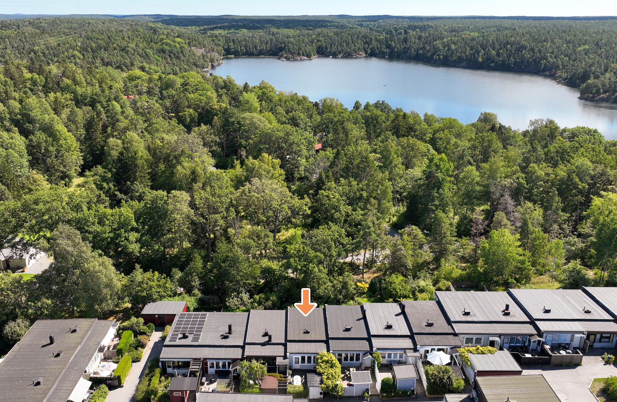 Huset har ett mycket barnvänligt läge intill ett av områdets finaste torg med jättefin nyrenoverad lekplats. Den stora fina tomten på baksidan ligger med gräns direkt mot skogsallmänning som i sin tur gränsar mot vidsträckta naturområden och Tyresö Flatensjön.